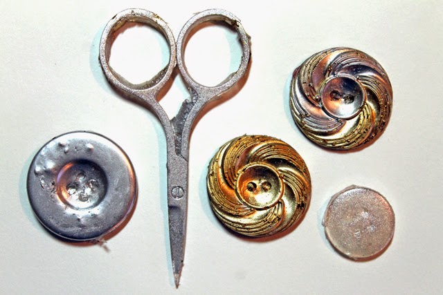 To try out my new mold, I dusted the inside with a little bit of Alumilite metallic powders and then poured in some Amazing Clear Cast, which also took a while to completely cure. You can see my completed resin buttons and scissors below. They came out quite nicely, I think!