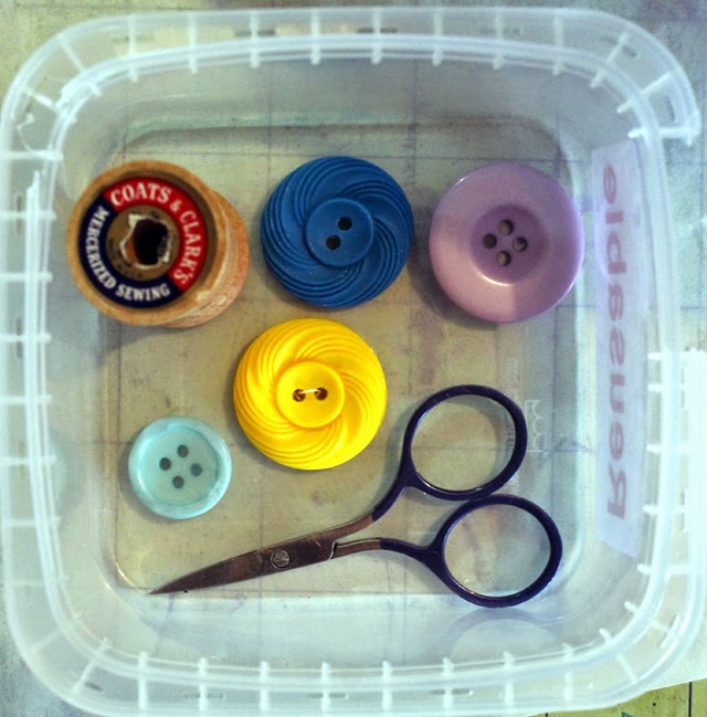 For my first test project using the remelt mold, I chose a few buttons, tiny embroidery scissors and a mini spool. I took the remelt material out of it's container, cut it up into little squares (It looks a lot like Jello when you do this!) and microwaved for about 15 seconds at a time until it was a liquid.