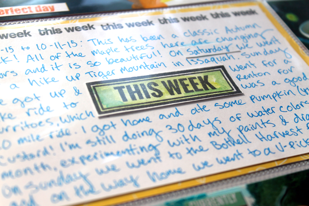 I do not do a weekly project life spread, I would never keep up with that. I do however like the pocket page format, so every now and then I'll make a weekly spread to include in my regular scrapbook to document a specific week or adventure.
