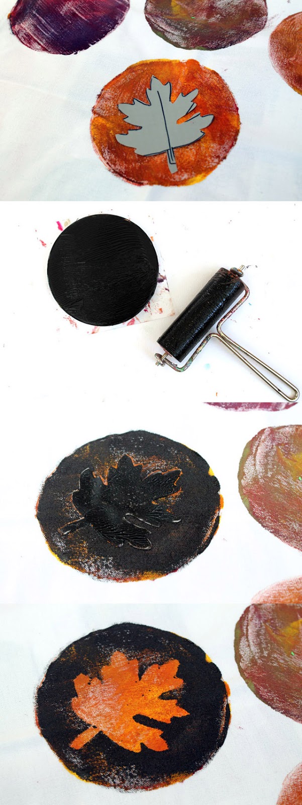I started by applying acrylic paints to my gelli plate- I love this new(ish) circle gelli plate. I stuck with autumn themed colors, like oranges and reds. Warm colors.