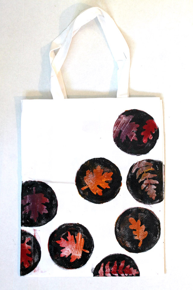 I used my gelli plate like a stamp. Since it's so small (4") it was easy to pick up and flip over. I printed multiple circles around my tote bag.