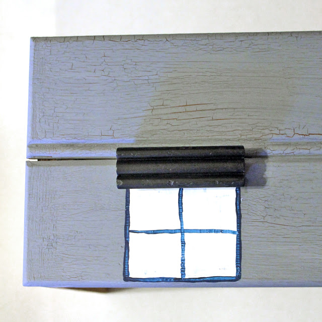 4. Following the pattern, sketch the windows underneath all of the handles except the one on the bottom drawer. Paint the windows in Snow White. Let dry. Once dry, outline in Navy Blue.