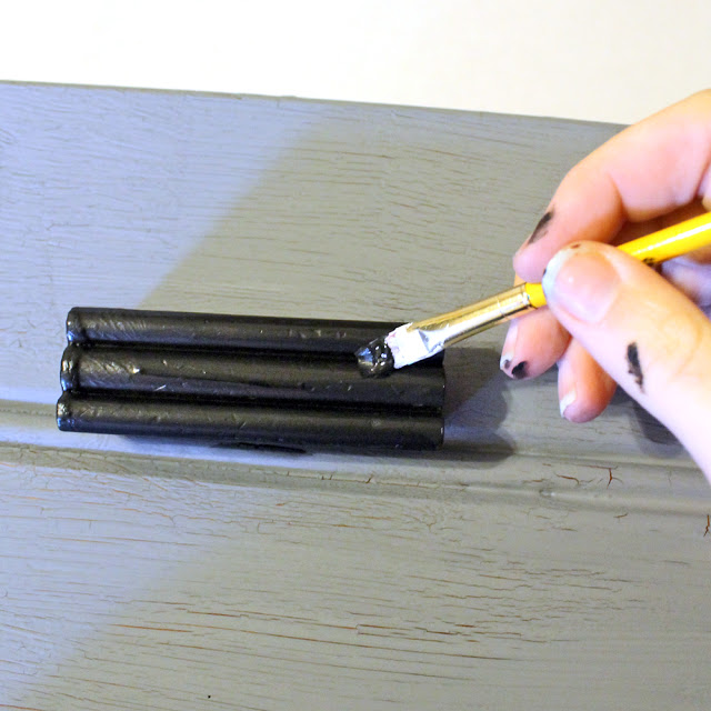 3. Paint the wooden drawer handles in Carbon using a 1/4" flat brush. (If using metal handles, paint using Black Tie.)