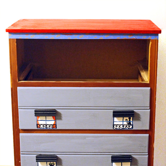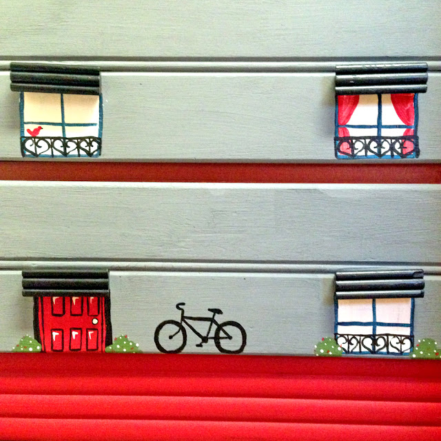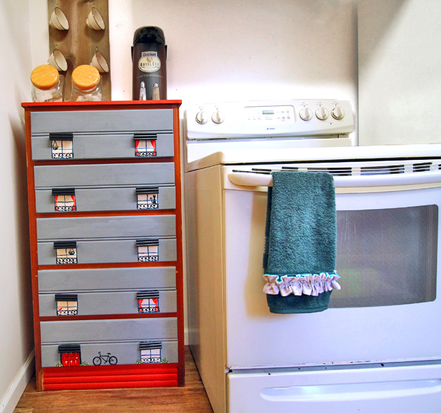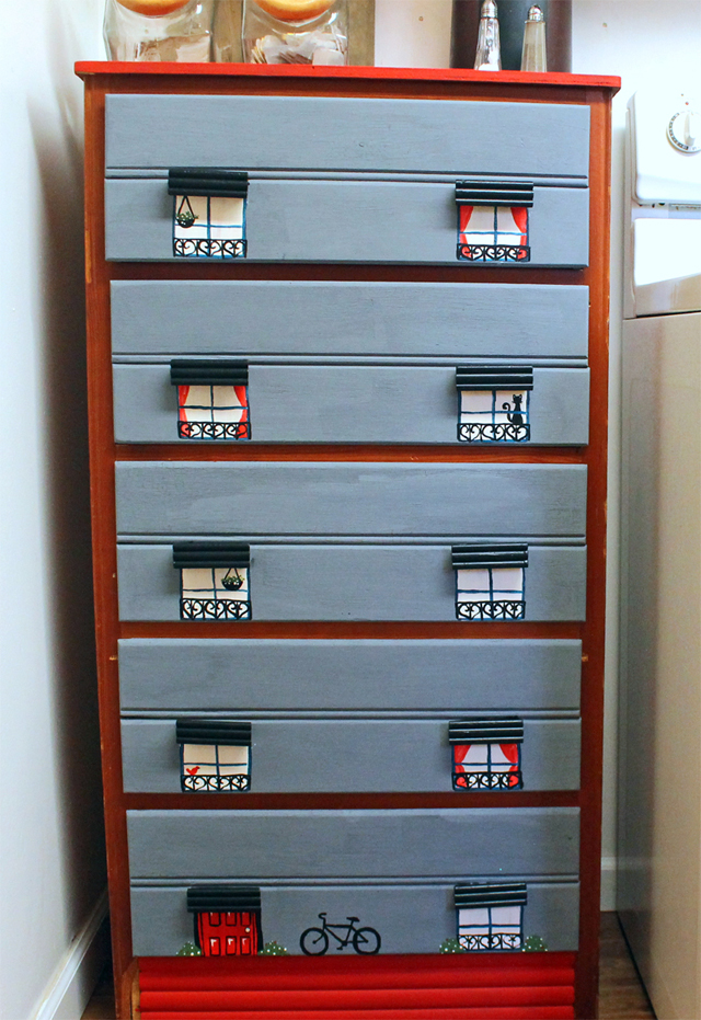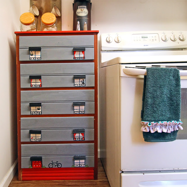 Well, anyway, I bought this dresser for less than $10 at the thrift store to put in our kitchen to hold my many boxes of tea, spices, etc. I wasn't sure how I was going to paint it until I was looking at a magazine at our library and saw a piece of furniture that was painted to look like an apartment building and loved the idea.
