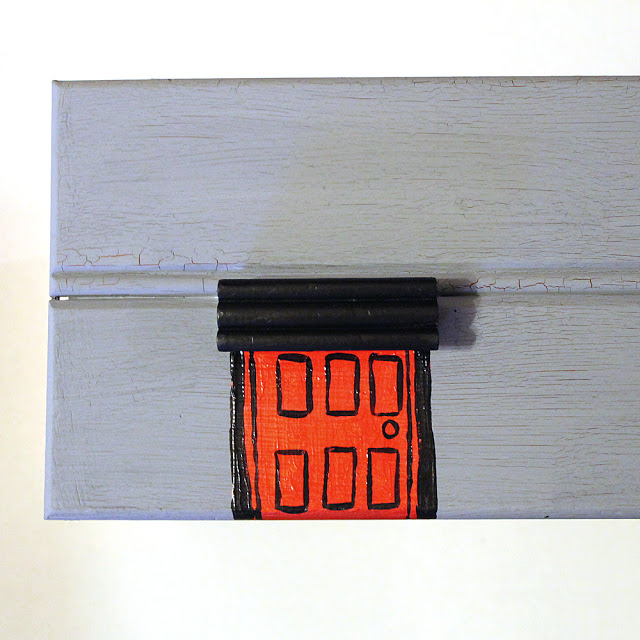 5. On the bottom dresser drawer, there will be one door and one window. Use a pencil to lightly sketch on the door, using the pattern as a guide. Paint in Naphthol Red; let dry and outline in Lamp Black once dry.