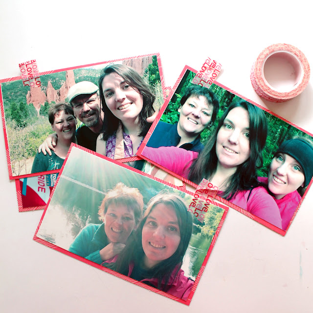 9. Print photos at 3" x 5" (or the appropriate size for the box). Mat them with pink cardstock paper and add washi tape tabs.