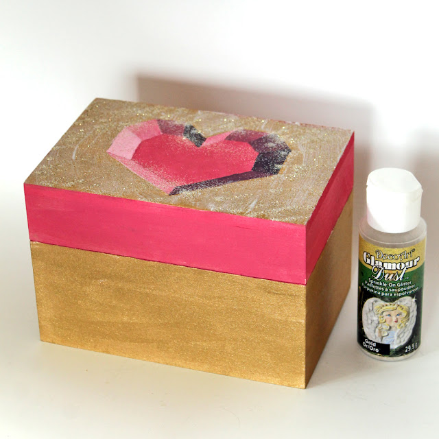 6. Being careful to stay outside of the heart, brush the lid with Americana Gloss Decou-Page and sprinkle Gold Glamour Dust on top while it is still wet.