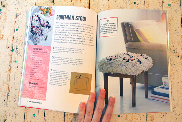 In this book Elspeth shows you 30 different ways to upcycle fabric using the rag rug technique and not all of them are rugs! There is a great variety of different projects, like this stool below:
