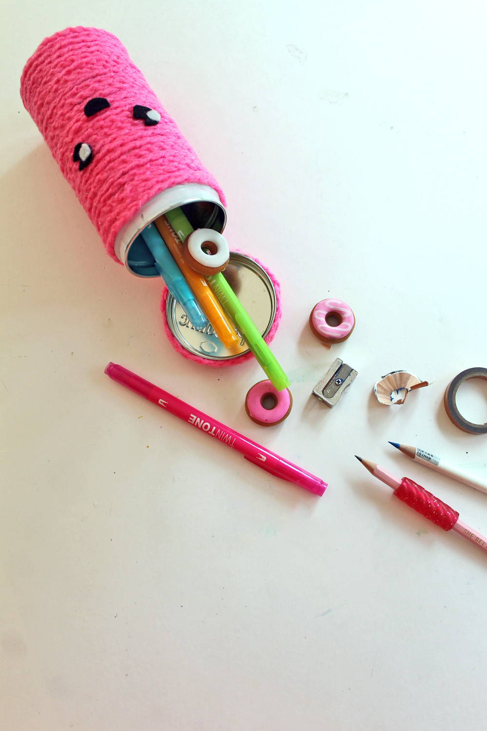 Now just fill your tin with all of your favorite office and school supplies! I've got some donut erasers, a pencil sharpener and my Tombow TwinTone markers!