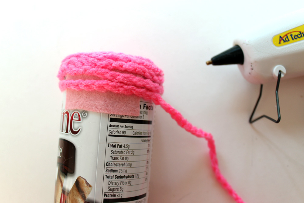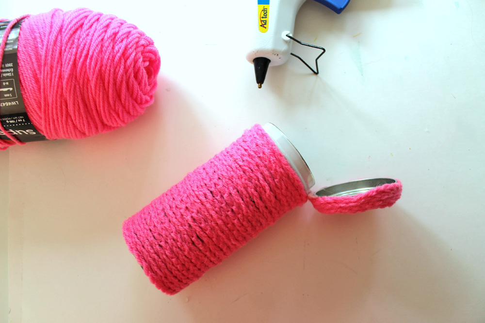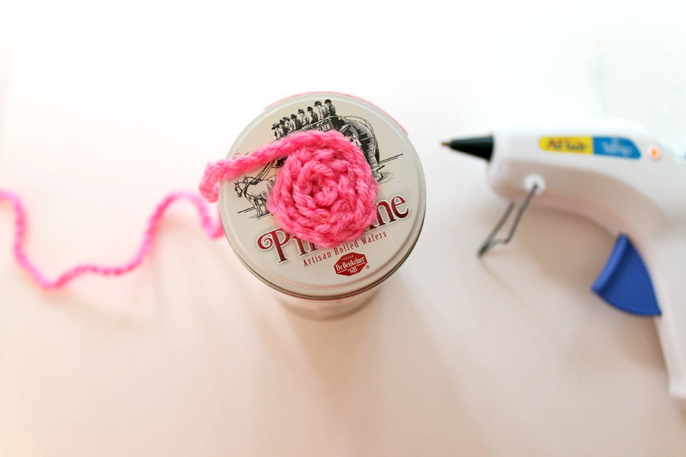 4. Once you get to the bottom of the lid, simply shift the crochet chain down and continue spiraling the yarn down the body of the tin, adhering it to the tin so it stays put.