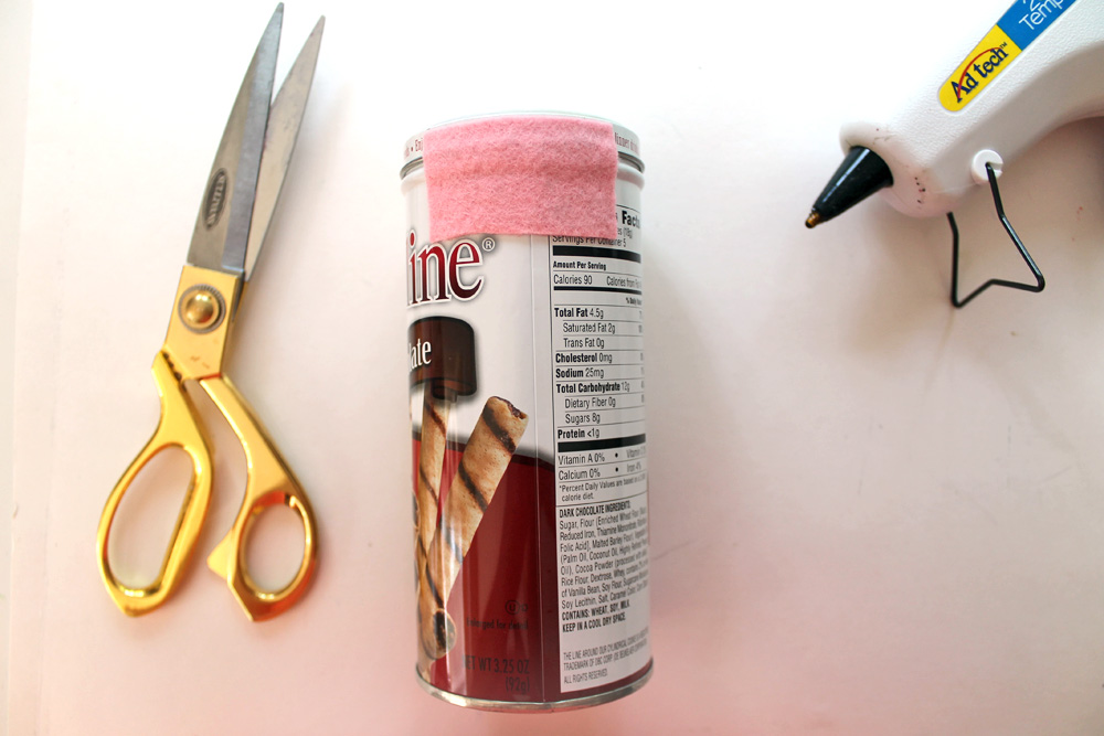 Have you ever wished that you had a fuzzy little tin to hold your pencils and school supplies? Well, I did! So I whipped up this cute guy from an empty Pirouline Cookie tin!
