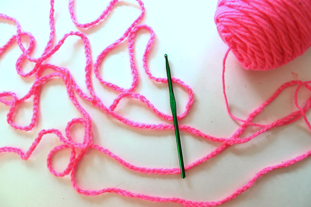 2. You will want to crochet one long chain using your yarn. If you don't already know how to crochet, the chain stitch is the easiest stitch to do, you can even do it with your fingers if you don't have a crochet hook.