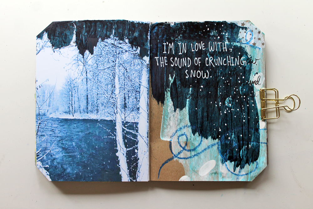 I also created this second spread this week, although I don't love it. The photo is one I took in my backyard at Christmas (we got snow on Christmas! yay!), but I don't love that I scraped paint on to the top of it. Oh well.