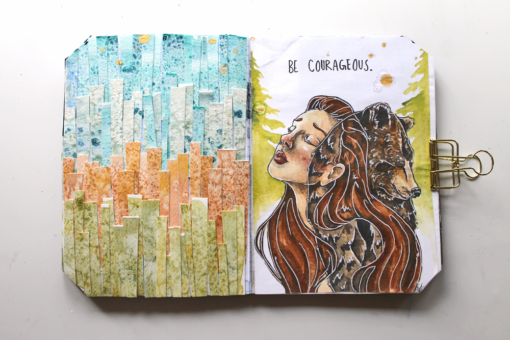 I created this first page early on in the week. The collage on the left half of the page is inspired by the collage style of Essie. She makes some really neat journal pages using little paper strips. I cut up watercolor paper for this technique.